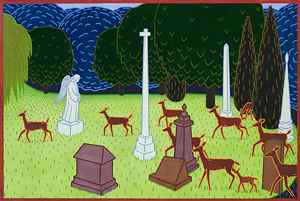 For the next 30 years Charles worked as a freelance conservator and artist, painting his surrounding environment -- landscapes, still lifes, figures, and interiors -- in a controlled, realist style. In the early 1980s Charles transitioned from subjects drawn from close observation to dreamlike imagery derived primarily from his imagination. His style also transformed dramatically at this time from realism to a distinctive, semi-abstract style characterized by bright colors and simplified forms.