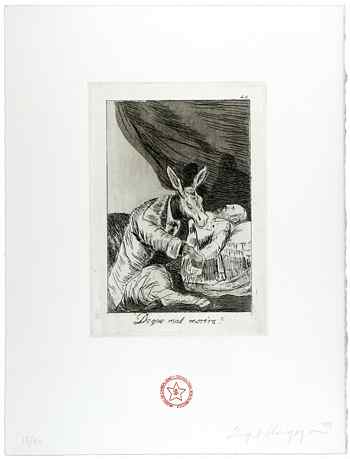Adrian Piper, a Harvard-trained philosopher and first-generation conceptual artist, came to prominence in the 1970s with works that advanced race and "identity politics" into the aesthetic realm. Her work on view, "Everything #18," like Ligon's, is also text-based. Upon commercially printed wallpaper that bears a documented copy of the American Constitution Piper superimposes the phrase "everything will be taken away." The quotation is adapted from Alexander Solzhenitsyn's Gulag Archipelago: "Once you have taken everything away from a man, he is no longer in your power. He is free." Undeniably confrontational, the work is installed on an imposing free-standing wall in the gallery. By juxtaposing the ominous phrase of the Russian novelist with the founding Enlightenment principles of our democracy -- and the modern type upon elaborately hand-written eighteenth-century penmanship -- Piper creates a situation in which these contrasting assertions comment on each other. (left: Enrique Chagoya (American, b. Mexico, 1953), ¿De qué mal morirá? (Of what illness will he die?) from Return to Goya's Caprichos, 1999, portfolio of eight prints: etching, aquatint, and drypoint, 14 ? x 11 inches each. Collection of the Middlebury College Museum of Art.)