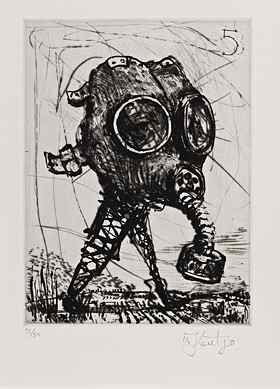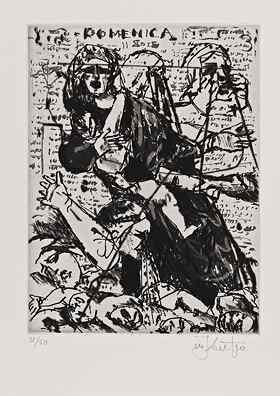 In contrast to Piper and Gober, works by Enrique Chagoya and William Kentridge employ traditional modes of printmaking -- etching, aquatint, engraving, and drypoint. These suites demand and reward close scrutiny. In his "Return to Goya's Caprichos," Chagoya purposefully updates Francisco Goya's bitingly satirical series of prints depicting human depravity and folly during the Napoleonic era. In "L'Inesorabile Avanzata [The Inexorable Advance]," internationally acclaimed South African artist William Kentridge revisits newspaper accounts of Benito Mussolini's mid-1930s invasion and seizure of Abyssinia (now Ethiopia). An act of aggression supported by Hitler, this foray, described by some historians as a "last gasp of colonialism," demonstrated the weakness of the League of Nations and preceded Germany's march into the Sudetenland and the onset of World War II.
