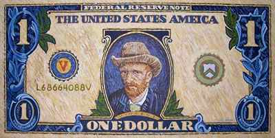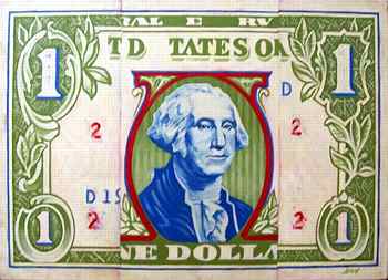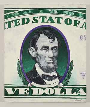 Dowd's paintings were emotional and complex -- the very antithesis of mainstream Pop Art. He did not know how to divorce his subjective perceptions and create art that was remote and unemotional. When addressing money, or any subject, Dowd entered into a personal dialog. He edited and altered his sources, freely adding and removing elements, all to explore deeper truths about how objects function in our lives. He was intrigued by paradoxes, and was amused by the paradox that nothing is valued more highly than money yet it is nothing more than flimsy pieces of printed paper. As an artist he saw this process of transformation from the meaningless to the meaningful as embodying the essence of all art. To understand this process, Dowd dissected money and explored its multiple levels of imagery. He questioned the authority of the pictured presidents, substituting their famed portraits with those of subversive modern artists. He rethought and restructured the regal aura of the compositions -- an odd amalgam of mottoes, signs, symbols, numerals and inscriptions. He even addressed the ways money is made personal and individual in the ways we handle, fold, and pass it from person to person.