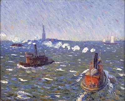 Because of the NBMAA's exclusive focus on American art and its longstanding history collecting works by The Eight, it is only fitting that this exhibition will be on view in New Britain. Industrialist John Butler Talcott endowed a fund in 1903 to purchase art for the New Britain Museum, and the committee visited Macbeth Galleries in 1908 just as The Eight were showing their rebellious art. The New Britain committee's choices were selective, and it took them sixteen years to acquire twenty pictures. Among them Remembrance, acquired in 1909, by Arthur B. Davies, represented The Eight until the late 1940s. Through the Harriet Russell Stanley Fund, created by Alix Welch Stanley in 1942, retired director of The Stanley Works, in memory of his wife, the NBMAA purchased 284 works of art, including sixteen works by The Eight. At present, the NBMAA has over 60 works by this group of artists. (left: William Glackens, Breezy Day, Tugboats, NY Harbor, c. 1910, oil on canvas, 26 x 31.75 inches, Milwaukee Art Museum)