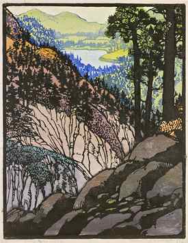 (above: Frances Gearhart, Glimpse of Big Bear Lake (Autumn Brocade), Color Block Print, 1931, 12 x 9 1/4 inches, Private Collection)
