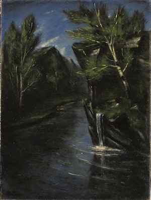 This painting of an Inlet hints at that power. Mattson manipulates the viewer's attention, drawing the eye around the rocky promontory in the center of the picture. Beyond that, presumably, is the sea, and the artist uses a misty, bluish tone to indicate light and water in the distance. The blues, grays and greens are typical of the artist, and are punctuated with whites, most prominently in the bright tones of the bark of a birch tree and in the water splashing on the rocks. Both this type of subject matter and the artist's preferred color choices were cited by critics as influence from Mattson's Scandinavian background.