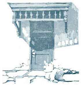 The image "Doorway" was created by using three different blocks cut and printed using the Reduction Print Process. Each block was cut and printed multiple times. The three blocks are title "the Key Block", "The Color Block", and "The Accent Block".