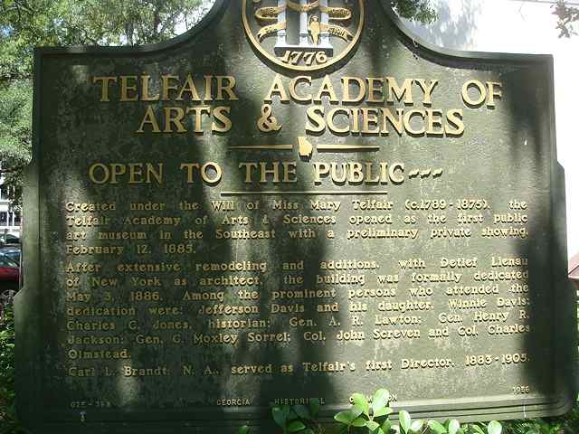 (above: Photo of detail of commemorative plaque titled "Telfair Academy of Arts & Sciences" near front entry of Telfair Museum of Art., May, 2011. Photo © John Hazeltine)