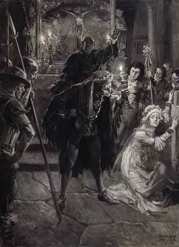 Here a young woman of his village cowers and claims sanctuary in a church,