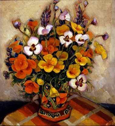 Edouard was recognized not only for his work in oils, but for the groundbreaking techniques he brought to his watercolors. The freshness and freedom with which he used the medium inspired a Southern California watercolor movement. Luvena's paintings, including portraits, figures, landscapes, flowers and still lifes -- were almost exclusively in oil. She considered herself an uncompromising realist with the utmost desire for directness and simplicity. Luvena's still lifes were described as "rich and juicy."