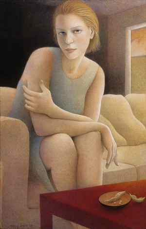 The faces of her subjects are porcelain-smooth, the eyes almond shaped. "I think what gives them that Botticelli quality is the medium," says Smith, who studied egg tempera at the Seattle Academy of Fine Art in 2002. Egg tempera wasused by artists as diverse as Botticelli, Vermeer and Andrew Wyeth.The resulting images seem to radiate light from within, making the people who inhabit her luminous world slightly surreal. "I've always been fascinated by the technique, having seen it at the Metropolitan Museum and at the Uffizi (in Florence)."