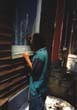 Marquis Eddy paints faux lace curtain on boarded window)