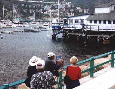 Raleigh Kinney was completing a pencil sketch on which he was going to apply watercolors. "The drawing gives me everything I need to complete a painting or to paint a new one," he told me. He and his wife, who manages his career, travel to over 30 art shows each year. Stan Sampson is the only PAPA painter who lives full time on the island. He presented a picturesque sight - bushy white whiskers and a funny hat. "Fifteen or twenty years ago we couldn't pay people to paint outside with us," he said. Sampson won "Best of Show" at Catalina 2001 in September.