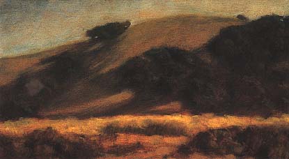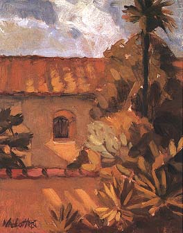 From top to bottom: Meredith Abbott, Summer Evening, 18 x 20 inches, oil on linen, colllection of Joseph R. Henderson; John Comer, Spanish Ranch, Cuyama Valley, 20 x 34 inches, oil, collection of Drs. Terrence McBride and Linda Sobelman; Glenna Hartmann, Ranch House, 13 1/4 x 15 inches, pastel; collection of Mr. and Mrs. Robert Hyland; Bjorn Rye, Todos Santos, 12 x 22 inches, oil on panel, collection of the artist; Whitney Brooks Abbott, Mission Santa Ines, 10 x 8 inches, oil on panel, collection of the artist.