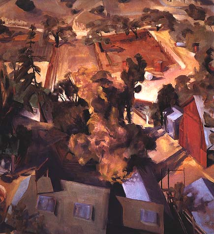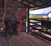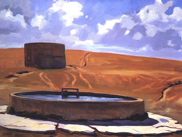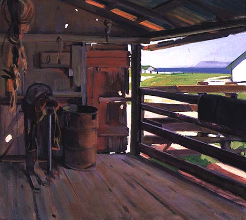 From top to bottom: Ray Strong, Santa Ynez River, 18 x 36 inches, oil on canvas, collection of the artist; Joellyn Duesberry, Ranch Yard in California, 36 x 30 inches, oil on linen, collection of Mr. and Mrs. Brink Thorne; Marcia Burtt, The Tack Room, Santa Rosa Island, 30 x 30 inches, acrylic, collection of Margaret Vail Wolley; Arturo Tello, All Paths Lead to Water, 18 x 24 inches, oil on canvas, collection of Margaret Vail Wolley.