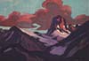 From top to bottom: Woman at Fountain, oil on canvas, 6 3/4 x 10 inches; Woman at Laguna Beach, oil on canvas, 6 3/4 x 9 3/4 inches; Stylized Mountains, oil on board, 13 x 19 inches.