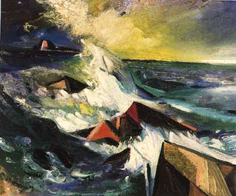On February 4, 1974, Karl Baumann was diagnosed with lung cancer and given six months to live. In May, he was administered cobalt, which left him sick and weak. Responding to this treatment, Baumann painted "Cobalt," 1974, where shape, line, color and form speak directly to the viewer on an emotional level. In June, Baumann entered the Contrarus clinic in Mexico, where he underwent 21 days of laetril treatment. After the program, Baumann continued with a predominantly vegetarian diet, supplemented with eight to ten apricot pits a day. Two years later, he miraculously showed no signs of cancer. Baumann produced few paintings after 1974. In 1976, his son, Nicholas, was murdered in San Francisco. This affected Baumann so deeply that he lost the desire to paint. Karl Baumann died of a heart attack in 1985. Above Right: Sea Scape, 1949, oil on board, 15 1/2 x 19 1/4 inches
