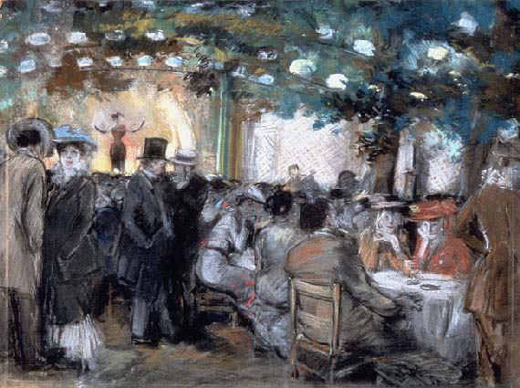 From top to bottom: Everett Shinn, Matinee, Outdoor Stage, Paris, 1902, pastel on paper, 18 x 26 inches, collection of Margaret and Raymond Horowitz; Edward Potthast, Beach Scene, c. 1915, oil on panel, 11 x 15 7/8 inches, collection of Margaret and Raymond Horowitz; Frank W. Benson, A Summer Day, 1911, oil on canvas, 36 1/8 x 32 1/8 inches, collection of Margaret and Raymond Horowitz; William Merritt Chase, Back of a Nude, c. 1888, pastel on paper, 18 x 33 inches, collection of Margaret and Raymond Horowitz; Cecilia Beaux, Ethel Page (Mrs. James Large), 1890, pastel on paper, 16 1/8 x 12 inches, collection of Margaret and Raymond Horowitz; Dennis Miller Bunker, Roadside Cottage, c. 1889, oil on canvas, 25 1/16 x 30 inches, collection of Margaret and Raymond Horowitz
