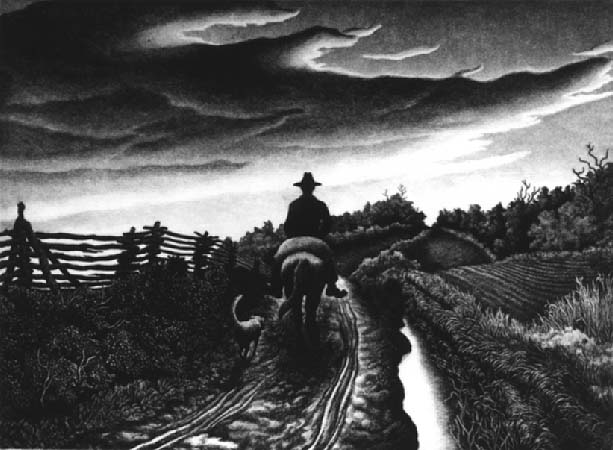 etching November Evening, for example, a farmer rides on his horse