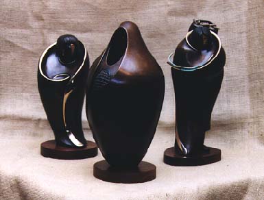 Images from top to bottom (click on images to enlarge them): Baje Whitethorne, Chaser of the Inlaws, acrylic, 12 x 23 1/2 inches; Marie Yazzie, Serape Revival, 54 x 86 inches, Navajo rug; Al Qoyawayma, Hopi Maiden (far left) bronze, 10 x 4 1/2 inches, Blanketed Corn Maiden (middle bronze), bronze, 12 x 5 1/2 inches, So'O (far right), bronze, 12 x 5 inches.