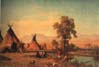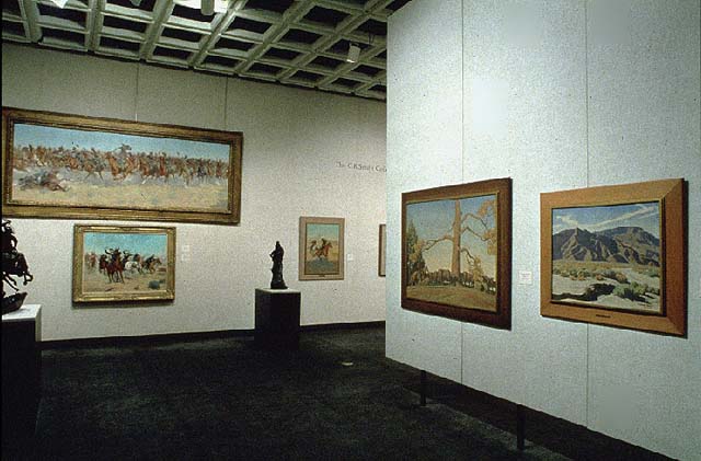 From top to bottom: Albert Bierstadt, Sioux Village near Fort Laramie, 1859, oil on wood panel, 12 1/2 x 19 1/2 inches, Charles M. Russell, Get 'Em Out of There, c. 1915, watercolor on paper, 18 1/2 x 25 inches; Albert Bierstadt, Indian Canoe, c. 1886, oil on canvas, 21 5/8 x 30 inches; Maynard Dixon, Top of the Ridge, 1933, oil on canvas, 36 x 48 inches; Thomas Moran, The Golden Hour, 1875, oil on canvas, 9 1/2 x 13 5/8 inches; Arthur Fitzwilliam Tait, Huntsman with Deer, Horse and Rifle, 1854, oil on canvas, 30 1/4 x 44 1/8 inches. All works are gifts of C. R. Smith.