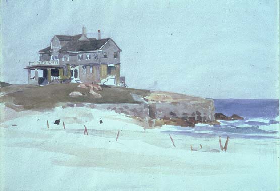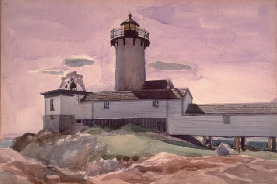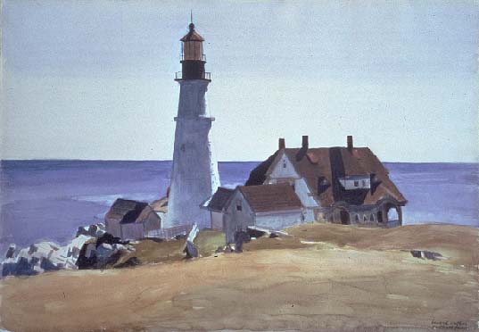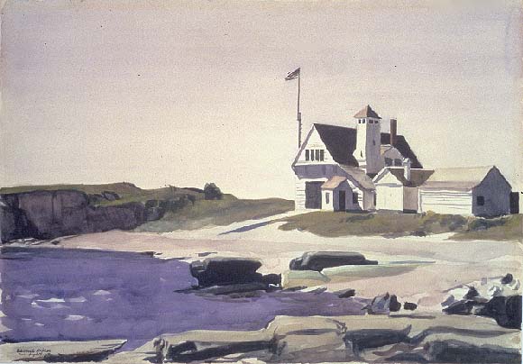 Edward Hopper paintings from top to bottom: Coast Guard Station, 1927, watercolor, gouache and charcoal, 13 7/8 x 19 7/8 inches, The Metropolitan Museum of Art, The Lesley and Emma Sheafer Collection, Bequest of Emma A. Sheafer, 1973; Saltillo Mansion, 1943, watercolor, 21 1/4 x 27 1/8 inches, The Metropolitan Museum of Art, Geaorge A. Hearn Fund, 1945; Folly Beach, 1929, watercolor, gouache and charcoal, 13 7/8 x 19 3/4 inches, The Metropolitan Museum of Art, The Lesley and Emma Sheafer Collection, Bequest of Emma A. Sheafer, 1973; Portland Head Light, 1927, watercolor over charcoal, 13.5 x 19.5 inches, Museum of Fine Arts, Boston. Bequest of John T. Spaulding, 1948; Light at Two Lights, 1927, watercolor, 14 x 20 inches, The Montgomery Museum of Fine Arts, Montgomery, Alabama, The Blount Collection; Roofs at Washington Square, 1926, watercolor over charcoal, 13 7/8 x 19 7/8 inches, Carnegie Museum of Art, Pittsburgh, Bequest of Mr. and Mrs. James H. Beal, 1993; House with Big Pine, 1935, watercolor, 20.5 x 25.25 inches, New England Collector; Eastern Point Light, 1923, watercolor, 14 x 20 inches, Private Collection; House by the Sea, 1923 or 1924, watercolor and graphite, 13 15/16 x 20 inches, Whitney Museum of American Art, New York, Josephine N. Hopper Bequest; Funnel of Trawler, 1924, watercolor, 13 1/2 x 19 1/2 inches, Kathy and Bruce Hornsby; The Mansard Roof, 1923, watercolor over pencil, 14 x 20 inches, Brooklyn Museum of Art, Museum Collection Fund; House on Pamet River, 1934, watercolor, 21 13/16 x 26 13/16 inches, Whitney Museum of American Art, New York, Purchase.