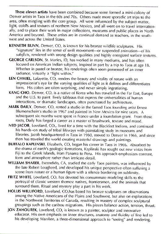 Art of Taos exhibition guide; third page of exhibition guide listing