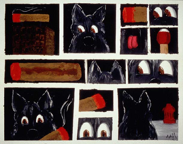 Michael McWillie's (b. 1950) paintings filled with reoccurring dogs are fun, whimsical, expressive works. He showcases the notion of what animals might think or perceive. His compositions, using various breeds, are like storyboards the tell their tale with color and shape. McWillie, who lives in Texas, has exhibited throughout the U.S.