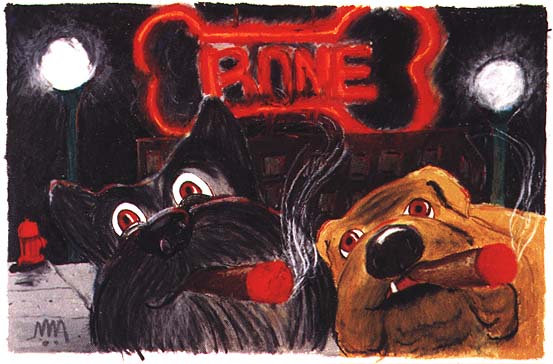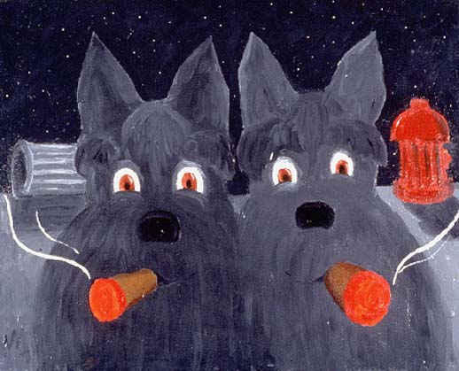 Humor, both in blatant hijinx and in subtle observation, is an essential part of McWillie's work. The dogs become characters, displaying a kind of avid sociability, in matched or mismatched pairs. These saucer-eyed buddies pose side by side against a bright blue Caribbean sky or in a London fog. Like the detectives or mobsters in a 1940's film noir, we often find them, with glowing cigars slack in their mouths, in the genre's typical settings: late at night, in front of a lurid neon sign or on an empty street.