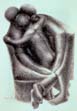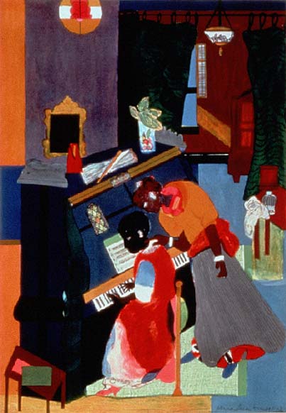 From left to right: Charles H. Alston, Women Washing Clothes, undated (c. 1970), oil pastel on paper; Romare Bearden, Morning Ritual, 1986, collage with acrylic on plywood; Romare Bearden, Homage to Mary Leu, 1984, lithograph; John T. Biggers, Family #1, 1974, conte crayon on paper.