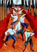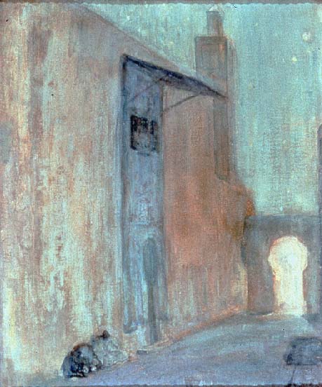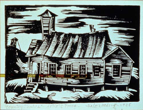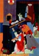 From left to right: Ann Tanksley, Canal Builders, 1989, oil on linen; Henry Ossawa Tanner, Gate in Tangier, undated (c. 1910), oil on canvas; Hale Woodruff, The Card Players, (c. 1978), oil on canvas; Hale Woodruff, Country Church, 1935, .linocut