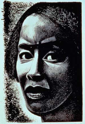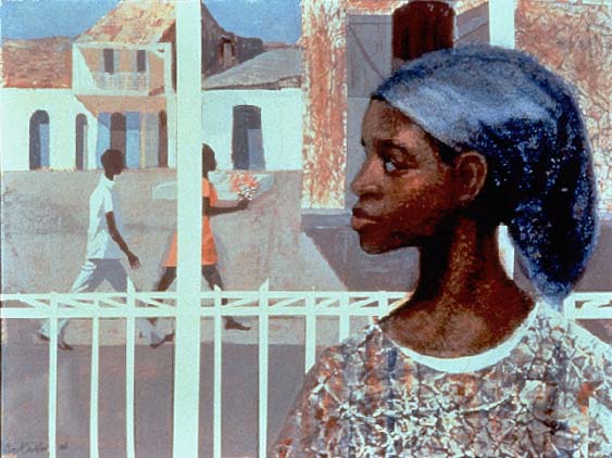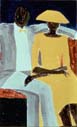 From left to right: Elizabeth Catlett, Head of a Woman, 1967, lithograph; Emest Crichlow, Woman in a Blue Coat, undated (c. 1948), oil on canvas; Emest Crichlow, The Balcony, 1980, Collage with acrylic on canvas; Jonathan Green, Easter, 1989, acrylic on paper.