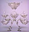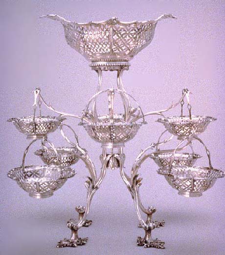 From top to bottom: George Rombey, Mrs. Roger Smith, Historic Charleston Foundation; John Francis Rigaud, John Moultrie III and Family, Gibbes Museum of Art; Rebecca Brewton Motte, Meissen porcelain set, c 1770; Epergne, Middleton Family Silver, Middleton Place Foundation.