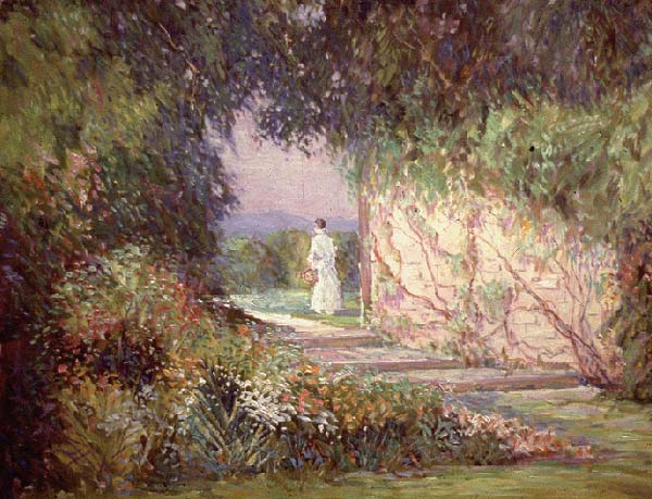 Early summer morning travels to gardens were his palette's delight. To be dazzled by iris, hollyhocks, poppies, delphinium and roses was pure joy to this artist. He loved the effects of light on nature's palette. It was his passion to record the transformation of nature into art, using his light-filled palette and broad sweeps of vibrant colors. Brilliant geraniums set in stone urns on the stone walls surrounding his terrace garden were part of his "backyard" repertoire. And the same brilliant flowers in pots were often depicted in their winter sun room off-season glory.