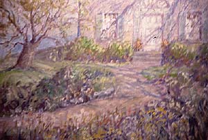 Over and over, he set his garden to paper and then to canvas. The flower beds, the stone walls, the ginkgo tree, the fence and the simple gray potting shed, appear in many of his garden paintings. His house (formerly a carriage house and part of a large estate) was splendid, filled with art inside and out. In addition to paintings and prints by artists ranging from Bicknell and Wiggins to Constable and Whistler, his studio painting easel had been the easel used by J. Alden Weir and the beautiful Italian carved wood doors and panels in the entry of Dennis' home were from Weir's Windham (Connecticut) farm .