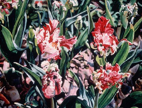 (left: Carolyn Brady, Red and White Parrot Tulips Unfolding,