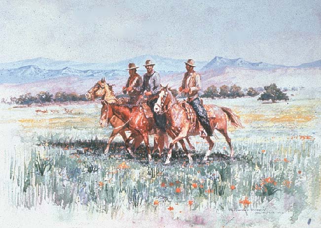 Three Buckaroos, 1922, watercolor on paper, 11 x 15 5/8 inches, collection of the Rockwell Museum, Corning New York