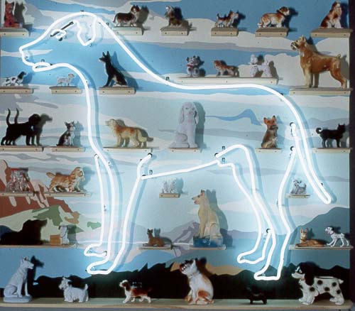 Willem Volkersz, Second Hand Dogs, 1998, neon, wood, paint, found objects, 48 x 57 inches, courtesy of the artist