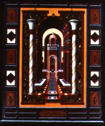 Drawing on historical and contemporary art sources, artist Richard Whitten creates intriguing puzzles of illusion and implied space. Using vibrant colors to highlight the meticulous detail and the complex architecture of his paintings, Whitten allows the edges of his works to break out of a confined rectangular format to freely flow beyond the borders, creating a sense of geometric freedom.