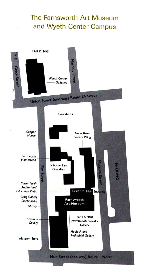 Right: Map relating Wyeth Center (top) to other buildings at the Farnsworth Museum campus
