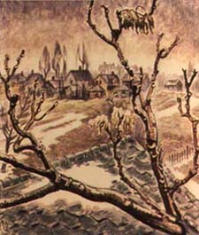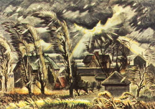 Burchfield was born in Ashtabula Harbor, Ohio in 1893, and grew up nearby in the small town of Salem. He graduated from the Cleveland School of Art in 1916. As a young man, the artist painted the rolling countryside and wooded enclaves of northeastern Ohio. Burchfield's passionate devotion to recreating on paper nature's occurrences would become his life's work. Inspired by his rural upbringing, the early watercolors included in the exhibition reveal his attunement to nature -- the rush of wind through the trees in Afternoon in the Grove (1916), the snow-heavy sky in New Moon in January (1918), and the sun's mystical light shining down in Untitled (Gothic Window Trees) (1918).