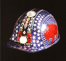 Above Left: Bingo War Bonnet, Richard Glazer-Danay (Caughnawaga Mohawk), 1995. Hardhat and acrylic paint. Loaned by the artist. Photograph by Mark Sexton. "One should not take this business of art too seriously. I often wonder why humorous art is not accorded the legitimacy that so-called 'high art' [has]," wrote the artist.