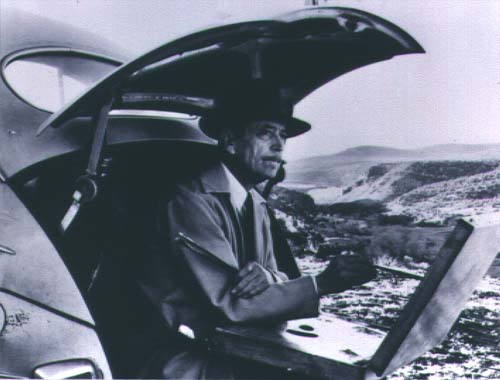 From top to bottom: Baking Bread, Taos, oil on canvas, Gift: Courtesy of Harrison Eiteljorg; The Blue Shawl, oil on canvas, Gift: Courtesy of Harrison Eiteljorg; Talpa Landscape, oil on masonite , Gift: Courtesy of Harrison Eiteljorg; Abiquiu Country, oil on masonite , Gift: Courtesy of Harrison Eiteljorg; Victor Higgins paints a "Little Gem" from the trunk of his car. Copyright 1979 Amon Carter Museum, Fort Worth, Texas, Bequest of Laura Gilpin.
