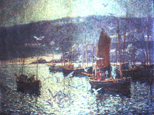 From left to right: Cool Shadows, oil on canvas, 29 x 36 inches; Kendall Woods Lodge, CT. , oil on canvas, 30 x 36 inches; Meeting House Hill; St. Ives, Cornwall, oil on canvas, 29 1/2 x 36 inches (click on images for enlargements)