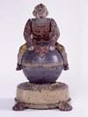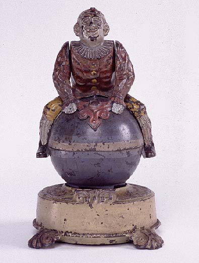 Right: Mechanical Bank, Clown on Globe, James H. Brown, cast iron, Bruce Museum collection, gift of Samuel F. Pryor